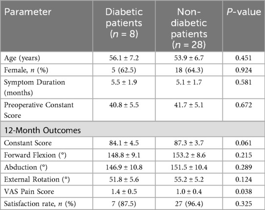 Among the 36 patients in the MUA group, 8 (22.2%) had a pre-existing diagnosis of well-controlled type 2 diabetes mellitus (mean HbA1c: 7.1% ± 0.3%). The baseline characteristics between the diabetic and non-diabetic subgroups were comparable (Table 5). The post-hoc subgroup analysis revealed no statistically significant differences in the primary functional outcomes—Constant-Murley score and ROM—between the two subgroups at the 12-month follow-up (Table 5, all P > 0.05). However, diabetic patients reported a marginally higher, though statistically significant, residual VAS pain score (1.4 ± 0.5 vs. 1.0 ± 0.4, P = 0.038). Despite this, the satisfaction rate remained high in the diabetic subgroup (87.5% vs. 96.4% in non-diabetics, P = 0.325).