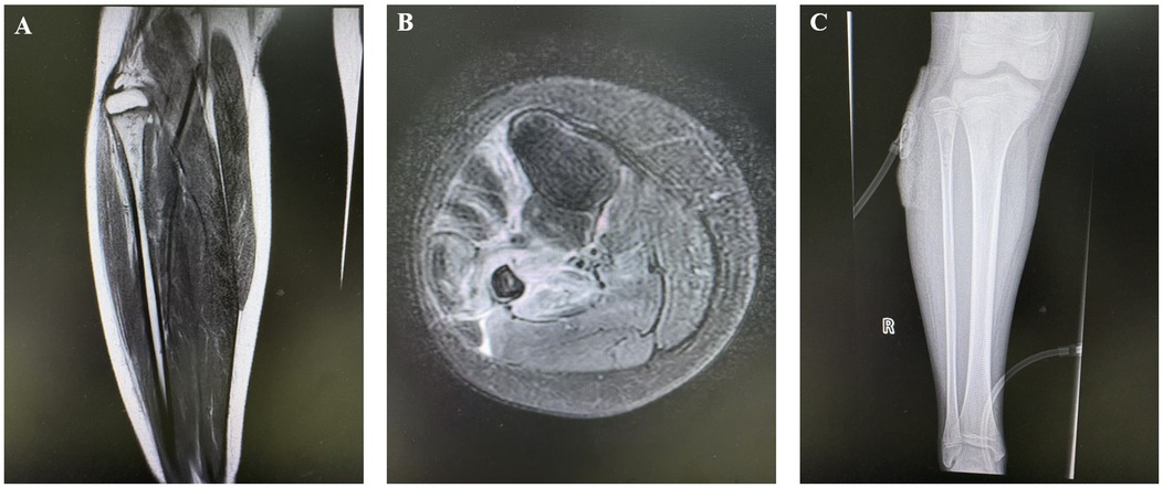 Figure 1. Preoperative and postoperative imaging of the patient. (A,B) Thickening of the periosteum in the proximal right fibula with high signal intensity. Osteomyelitis and possible bone destruction of the proximal right fibula are considered; (C) Irregular low-density shadow within the medullary cavity of the proximal right fibula and retained drainage tube shadow are visible.