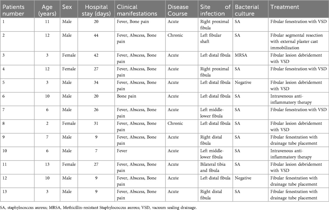 A total of 13 patients were included in this study, comprising 9 males and 4 females, with a median age of onset of 7.3 years (interquartile range 3, 11.5). The clinical presentation was predominantly acute (11 cases), with 2 chronic cases. Regarding microbiology, 10 patients had positive purulent cultures, with Staphylococcus aureus being the primary pathogen (including 1 case of methicillin-resistant Staphylococcus aureus), while 3 cases had negative cultures. The distribution of infection sites included 4 cases on the right side, 8 cases on the left side, and 1 bilateral case. Anatomically, 4 cases involved the proximal fibula, 5 cases the mid-shaft, and 4 cases the distal fibula. Clinically, 12 patients presented with fever, 10 developed local abscesses, and 12 experienced bone pain (Table 1).