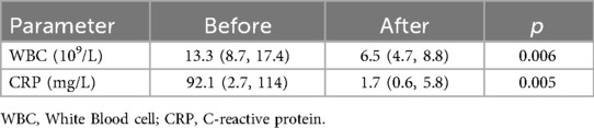 Two patients responded effectively to antibiotic therapy, while the remaining 11 patients underwent surgical intervention. Among these, 4 cases received fibular fenestration with VSD therapy, 3 cases underwent fibular debridement with VSD therapy, 3 cases had fibular fenestration with drainage tube placement, and 1 case required fibular segmental resection with external cast fixation. All patients showed improvement after treatment, with significant decreases in white blood cell count (13.3 × 10⁹/L vs. 6.5 × 10⁹/L, p = 0.006) and C-reactive protein levels (92.1 mg/L vs. 1.7 mg/L, p = 0.005) at discharge compared to admission (Table 2).