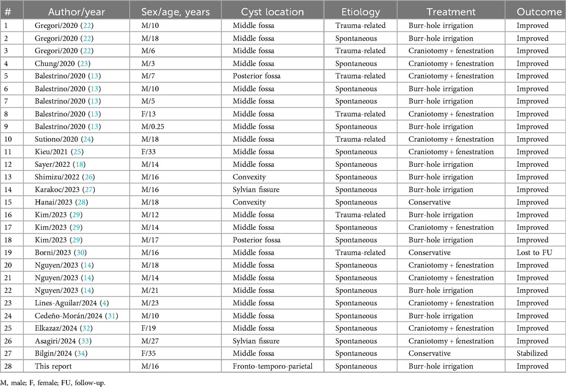 A total of 28 cases were identified and analyzed with respect to patient demographics, etiology, treatment modality, and clinical outcomes. The majority of patients were male (n = 24, 85.7%), with a mean age of 15.3 years (range: 3 months–35 years)—most cases (n = 21,75%) involved middle cranial fossa cysts. A history of minor or unrecognized trauma was reported in 7 cases (25.0%), while the remainder were truly spontaneous.