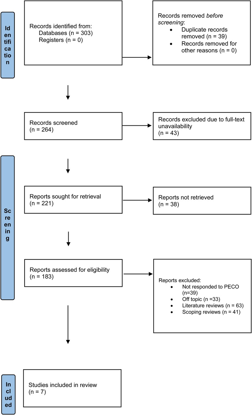 As seen in Figure 1, all 303 entries were found in all assessed databases in the first phase of the research selection process. There were 264 records remaining for evaluation after 39 duplicates were eliminated prior to screening. Since the full material could not be viewed at this time, 43 things were removed. As a result, an effort was made to acquire 221 reports. It was not possible to extract 38 of these records for additional analysis. Each of the 183 reports that were still available was carefully evaluated for eligibility. Out of the 39 studies that were judged to have violated the PICO requirements, 33 were considered off-topic, 63 were literature reviews, and 41 were scoping reviews. Seven systematic reviews and meta-analyses (18–24) were found to be appropriate for inclusion in the evaluation after these exclusion criteria were applied.