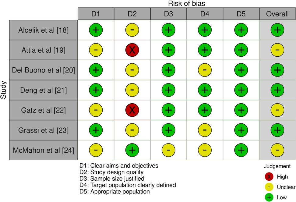The AMSTAR-2 evaluation produced a range of findings (Figure 2). Alcelik et al. (18) showed a low risk of bias overall, although they did show a low risk of bias across some categories. Although the study design of Attia et al. (19) was of good quality, the study's aims and target populations were not well defined, which resulted in an unknown risk of bias overall. Despite having low risks in a number of categories, Del Buono et al. (20) and Grassi et al. (23) were both deducted for having imprecise study designs and target population definitions, which resulted in generally low risks of bias. Deng et al. (21) upheld a low risk in every domain, confirming an all-encompassing low risk of bias. However, while having a solid study design, Gatz et al. (22) had problems with poorly defined populations and ambiguous aims, which led to an unknown overall bias. These problems were shared by Attia et al. (19). McMahon et al. (24) encountered difficulties with imprecise evaluations in the majority of areas, such as study design and target population, resulting in an overall imprecise risk of bias.