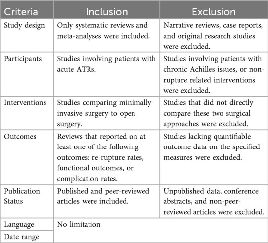 This umbrella review was carried out in accordance with the Preferred Reporting Items for Systematic Reviews and Meta-Analyses (PRISMA) criteria (16). Both a qualitative and quantitative summary of the findings was done when needed. The PECO (Population, Exposure, Comparator, Outcome) paradigm was applied in order to formulate the research question and direct the selection of the studies. Patients with acute ruptures of the Achilles tendon made up the population of interest. Treatments involving minimally invasive surgery were taken into consideration. The conventional open surgical techniques served as the comparative. Re-rupture rates, functional outcomes (as determined by instruments such as the Achilles tendon Total Rupture Score), and complication rates (which encompassed surgical site infections and nerve injury) were among the outcomes of interest. The different types of inclusion and exclusion criteria employed for this review have been elucidated through Table 1.