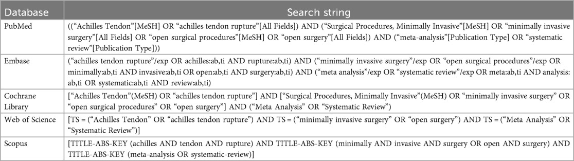 The search was conducted using five major databases: PubMed, Embase, Cochrane Library, Web of Science, and Scopus. The search strategies were tailored to each database's specific indexing system and search capabilities, employing a combination of MeSH (Medical Subject Headings) terms, Emtree terms (for Embase), and free text terms, using Boolean operators to refine and combine search terms, the schematics of which have been shown through Table 2. Terminology was harmonized throughout the manuscript: “minimally invasive surgery (MIS)” and “open surgery (OS)” were used consistently, outcome labels were standardized (e.g., “re-operation”, “wound complications”, “return to activity”), and style edits improved clarity, spelling, and consistency in tables, figures, and text.