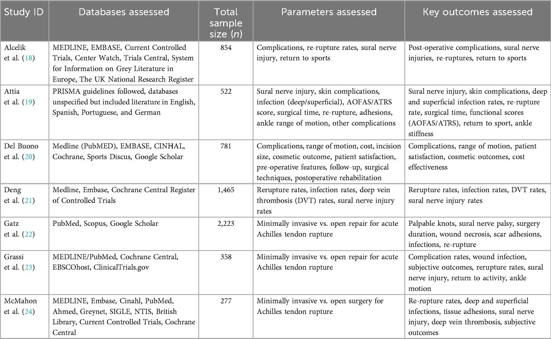 Table 3 shows the full picture of the demographic outcomes associated with different approaches for ATR as observed across the included investigations (18–24). Alcelik et al. (18) reviewed a total of 854 cases using a multimodal strategy that involved searching MEDLINE and EMBASE. Complications, re-rupture rates, sural nerve injury, and the patients' capacity to resume sports were the main areas of attention for their evaluation. Attia et al. (19) examined 522 cases from databases containing several languages while adhering to PRISMA principles. The assessment was broadened by their work to include sural nerve injury, skin problems, different rates of infection (both superficial and deep), functional scores like AOFAS/ATRS, surgery time, rates of re-rupture, adhesions, and ankle range of motion.