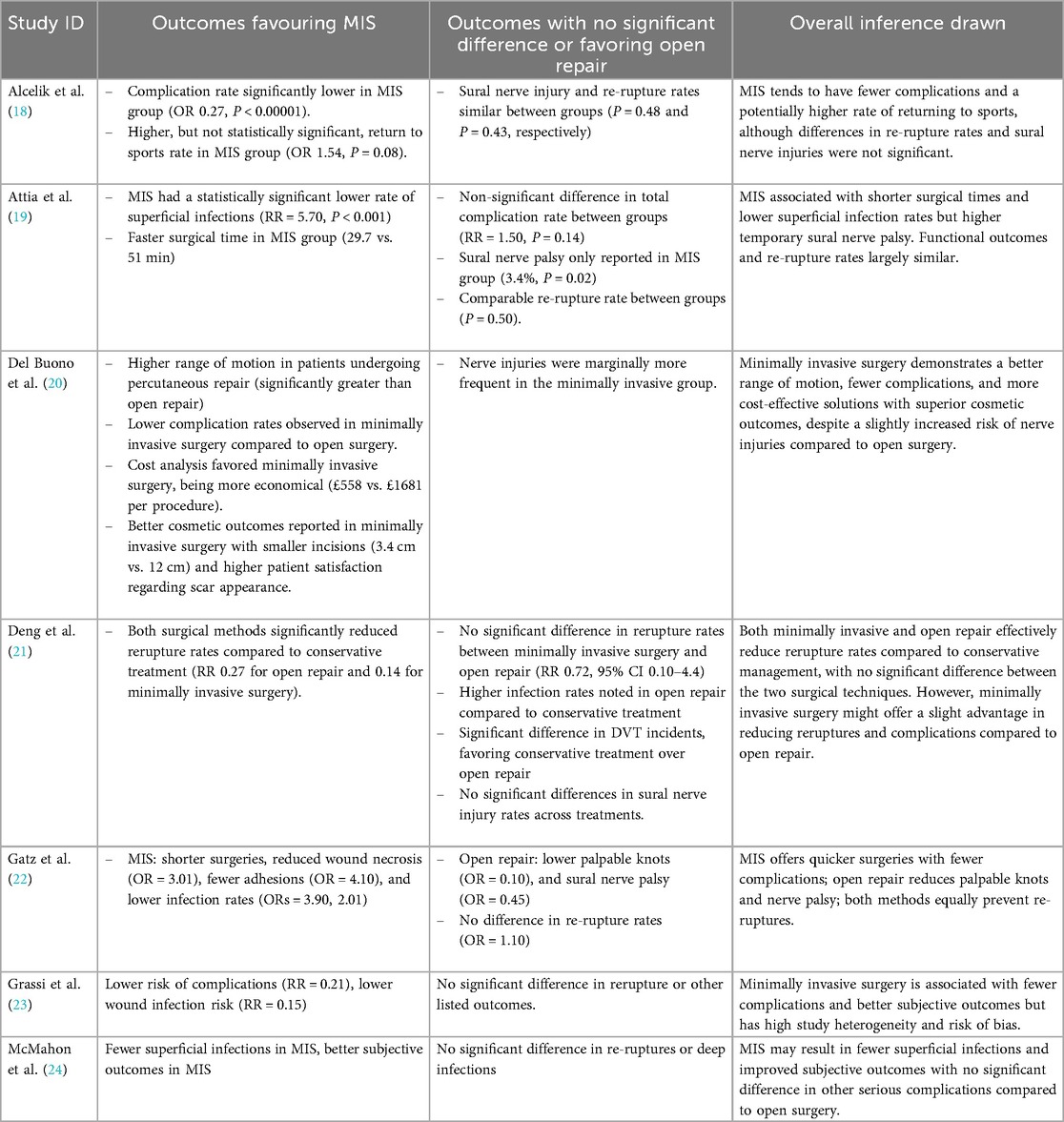 The majority of included reviews (18–20, 22–24) largely corroborates the advantages of MIS with regard to lower rates of complications, quicker recovery periods following surgery, and improved subjective and aesthetic results. On the other hand, the closeness in re-rupture rates amongst studies (18, 19, 21, 22) highlights an important area where MIS and OS functioned similarly. The modest difference in the incidence of nerve damage (19, 20) draws attention to a subtle drawback of MIS. Therefore, even while the general conclusion supports MIS due to its lower complication profile and effectiveness, the surgical team's specific experience and the characteristics of each patient should still be taken into account when selecting a surgical approach.