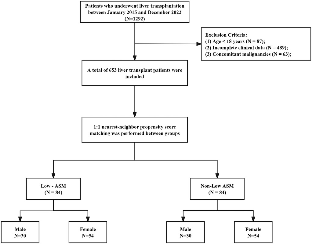 Methods: We retrospectively analyzed 653 LT patients at West China Hospital from 2015 to 2022. ASM index (ASM/H2) was calculated using Asian Working Group for Sarcopenia (AWGS) standards. Patients were classified into low and non-low ASM groups by sex-specific cutoffs. Propensity score matching (PSM, 1:1) was used to control for confounding. Associations with complications, inflammatory markers, and survival were evaluated using multivariate logistic and Cox regression. The predictive performance was evaluated using receiver operating characteristic (ROC) curves.