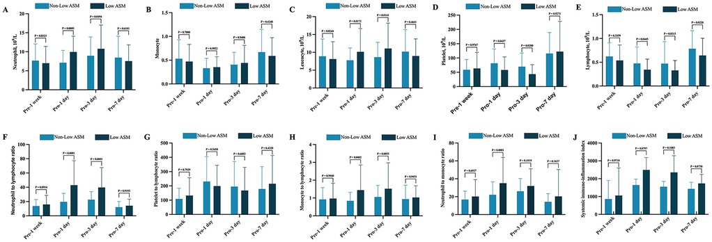 Figure 2. Dynamic perioperative changes in peripheral blood inflammatory markers between patients with and without Low preoperative ASM. (A) Neutrophil; (B) Monocyte; (C) Lymphocyte; (D) Leukocyte; (E) Platelet; (F) NLR (neutrophil-to-lymphocyte ratio); (G) PLR (platelet-to-lymphocyte ratio); (H) MLR (monocyte-to-lymphocyte ratio); (I) NMR (neutrophil-to-monocyte ratio); (J) SII (product of platelet count and neutrophil count divided by lymphocyte count). All results were analyzed using the following statistical methods. Normally distributed data were expressed as mean ± standard deviation (SD) and compared using the independent samples t-test. Non-normally distributed data are expressed as median and interquartile range (IQR) and analyzed using the Mann–Whitney U test.