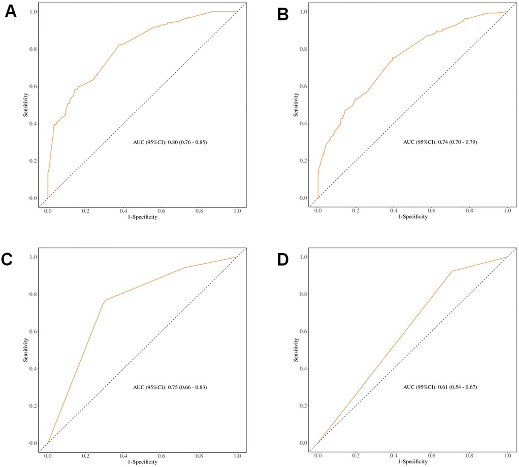 Figure 3. ROC curves for predicting different clinical outcomes. (A) ROC curve for early postoperative complications before PSM (including muscle mass); (B) ROC curve for early postoperative complications before PSM (excluding muscle mass); (C) ROC curve for early postoperative complications after PSM (including muscle mass); (D) ROC curve for early postoperative complications after PSM (excluding muscle mass).