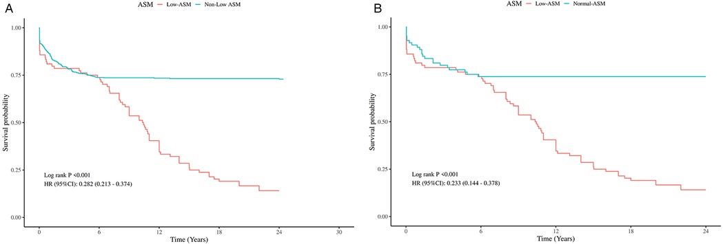 Figure 4. Kaplan–Meier analysis of OS by preoperative ASM Status, Pre- and post-PSM. (A) Comparison of OS between patients with and without low preoperative ASM before PSM. (B) Comparison of OS between patients with and without low preoperative ASM after PSM.