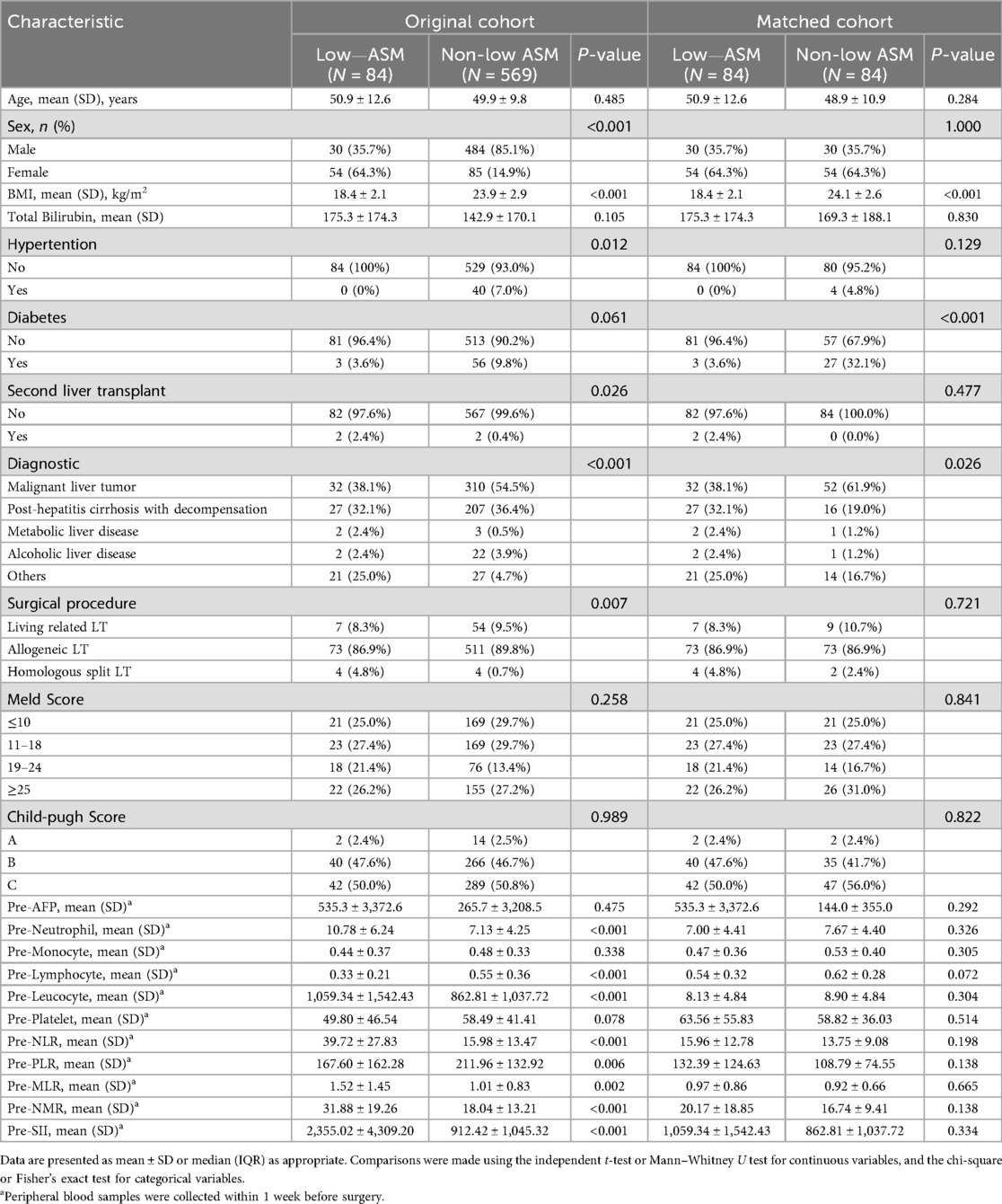 A total of 653 patients who underwent LT at West China Hospital, Sichuan University, between January 2015 and December 2022 were included in this study. The patient selection process is illustrated in Figure 1. The mean age of the cohort was 50 ± 10.23 years, with 78.7% male and 21.3% female patients. Based on the ASM evaluation, 84 patients (12.7%) were classified as having low preoperative muscle mass. Compared with patients in the normal muscle mass group, those in the low muscle mass group had a higher prevalence of liver malignancy (38.1% vs. 32.1%, P < 0.001), and exhibited significantly elevated levels of peripheral blood inflammatory markers prior to transplantation, including neutrophil count (10.78 ± 6.24 vs. 7.13 ± 4.25, P < 0.001), white blood cell count (1,059.34 ± 1,542.43 vs. 862.81 ± 1,037.72, P < 0.001), NLR (39.72 ± 27.83 vs. 15.98 ± 13.47, P < 0.001), MLR (1.52 ± 1.45 vs. 1.01 ± 0.83, P = 0.002), NMR (31.88 ± 19.26 vs. 18.04 ± 13.21, P < 0.001), and SII (2,355.02 ± 4,309.20 vs. 912.42 ± 1,045.32, P < 0.001). Conversely, lymphocyte count (0.33 ± 0.21 vs. 0.55 ± 0.36, P < 0.001) and PLR (167.60 ± 162.28 vs. 211.96 ± 132.92, P = 0.006) were significantly lower in the low muscle mass group. To account for potential confounders, propensity score matching (PSM) was applied using a 1:1 nearest-neighbor approach, yielding 84 matched pairs. Post-matching analysis confirmed balanced baseline characteristics—age, sex, BMI, comorbidities, liver disease etiology, and surgical procedure—between groups, with no statistically significant disparities (see Table 1).