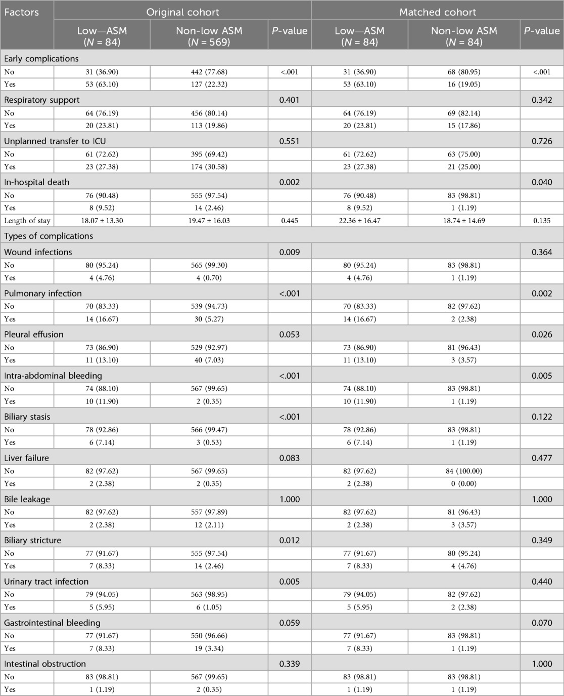 Table 2. Comparison of postoperative complications and outcomes between patients with and without low preoperative ASM before and after PSM.