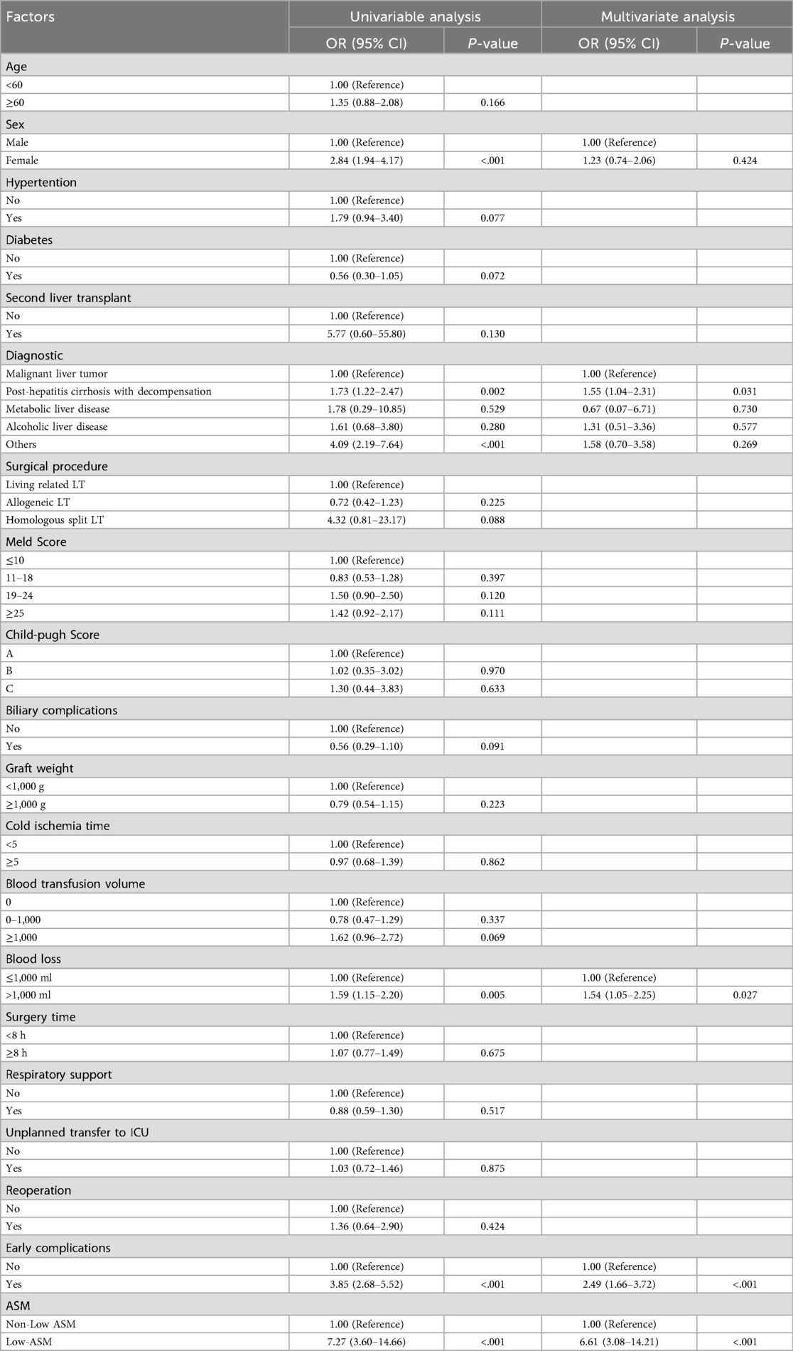 Our findings underscore that low preoperative ASM is an independent risk factor contributing to early postoperative complications in liver transplant recipients. After PSM, the incidence of early complications was significantly higher in patients with a low ASM (63.10% vs. 19.05%). These patients are more prone to pulmonary infections, intra-abdominal bleeding, and pleural effusion. Previous studies suggested that postoperative pulmonary infections may be linked to impaired mobility, increased fatigue, and immunosuppression (25–27). The increased incidence of pleural effusion may be secondary to pulmonary infection or associated with hypoalbuminemia caused by malnutrition (28, 29). However, owing to the lack of pleural effusion sample data, it remains unclear whether infection or reduced oncotic pressure is the primary cause, and further investigation is warranted. Postoperative bleeding risk was also notably higher in patients with reduced muscle mass, possibly because of increased portal pressure in patients with sarcopenia (30–32). Overall, these findings suggest that patients with low preoperative ASM are more vulnerable to infections, complications, and delayed recovery following LT. Previous evidence has highlighted the importance of intraoperative blood loss control and nutritional evaluation in improving long-term outcomes (33, 34). Additionally, the study found that patients diagnosed with decompensated cirrhosis before surgery experienced a higher incidence of early complications. Literature has shown that Decompensated cirrhosis is closely associated with muscle wasting, which is driven by impaired nutrient absorption, chronic inflammation, and reduced protein synthesis. In turn, muscle wasting exacerbates liver failure and immunosuppression, creating a vicious cycle (35–37). A meta-analysis by Markakis et al. further confirmed the relationship between preoperative sarcopenia and adverse outcomes (33).