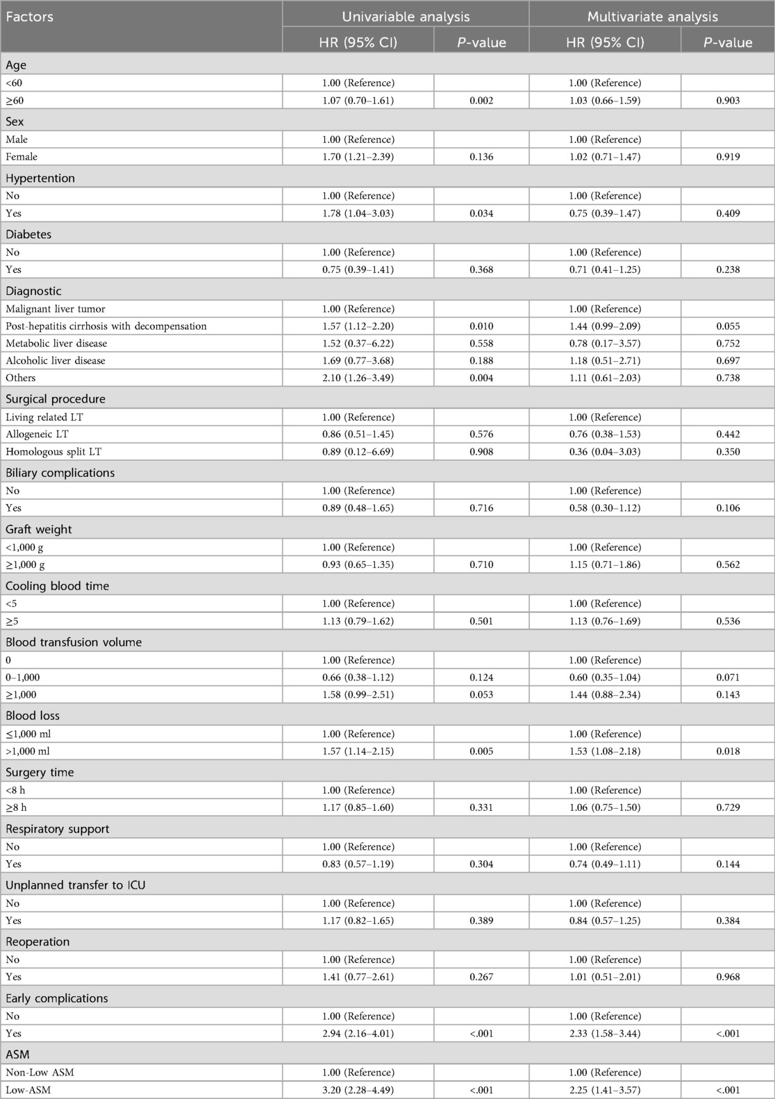 This study found that among patients who underwent LT between 2015 and 2022, the incidence of a low preoperative ASM was 12.8%. A single-center cohort study from the United States reported a higher incidence of 22%–50% (23), while a Turkish cohort study found a rate of 26% (24), suggesting that the incidence in China is relatively lower but still clinically significant.