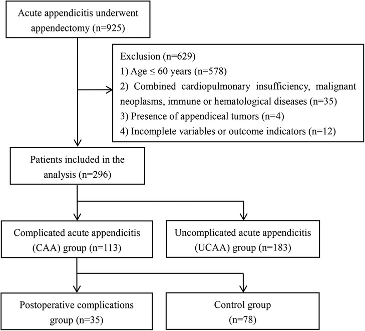 This retrospective observational study included elderly patients with AA who underwent appendectomies at our hospital between January 2020 and January 2025. Relevant clinical data were collected through the electronic medical record system. Subsequently, the research participants were selected based on the predefined inclusion and exclusion criteria. The inclusion criteria were as follows: (1) age >60 years (9); (2) patients who underwent a laparoscopic or open appendectomy; (3) patient's first onset of illness; and (4) pathological type was confirmed through both intraoperative and postoperative histopathological analyses. The exclusion criteria were as follows: (1) patients ≤60 years old and pregnant women; (2) patients with concurrent cardiopulmonary insufficiency, malignant neoplasms, or disorders of the immune and hematological systems; (3) patients whose postoperative pathological findings indicated the presence of appendiceal tumors; and (4) patients with incomplete medical records, examination results, and pathological findings. This study was reviewed and approved by the ethics committee of the Affiliated Hospital of Jiangsu University and was performed in accordance with the Declaration of Helsinki.