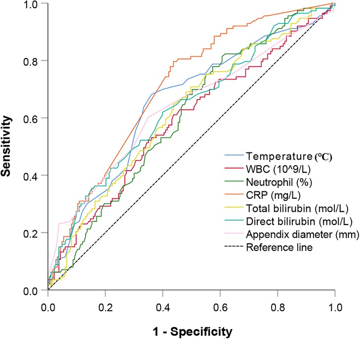 Figure 2. ROC curves for body temperature, serum WBC count, neutrophil percentage, CRP level, total bilirubin, direct bilirubin, and appendiceal diameter were constructed to evaluate their predictive value for the occurrence of CAA in elderly patients with AA. ROC, receiver operating characteristic; WBC, white blood cell; CRP, C-reactive protein; CAA, complicated acute appendicitis; AA, acute appendicitis.