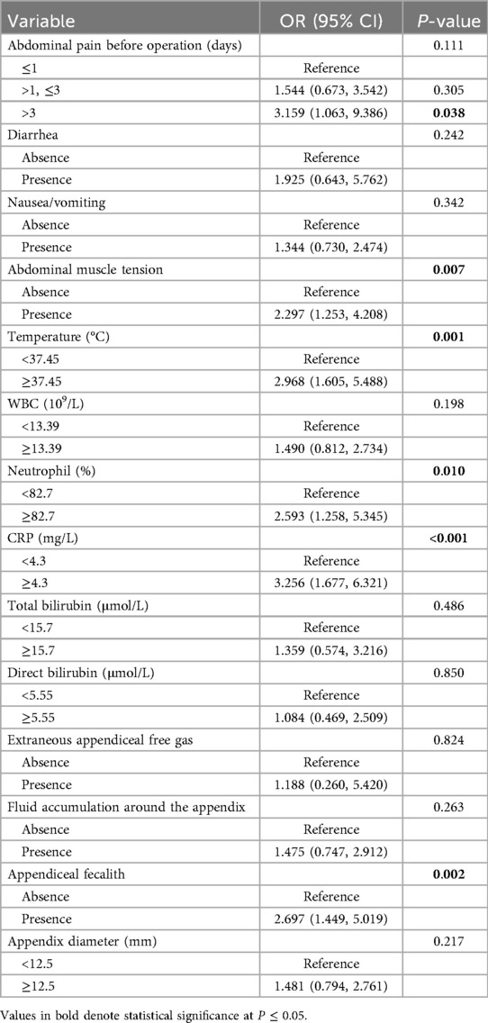 Table 2. Multivariate logistic regression analysis of risk factors associated with complicated acute appendicitis in elderly patients.
