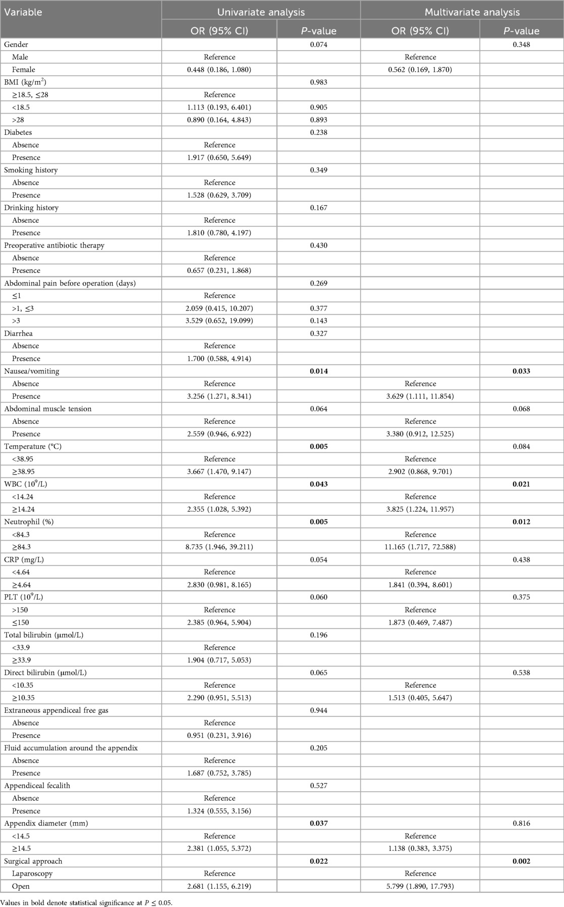 Table 3. Univariate and multivariate logistic regression analyses of risk factors associated with postoperative complications in elderly patients with complicated acute appendicitis.