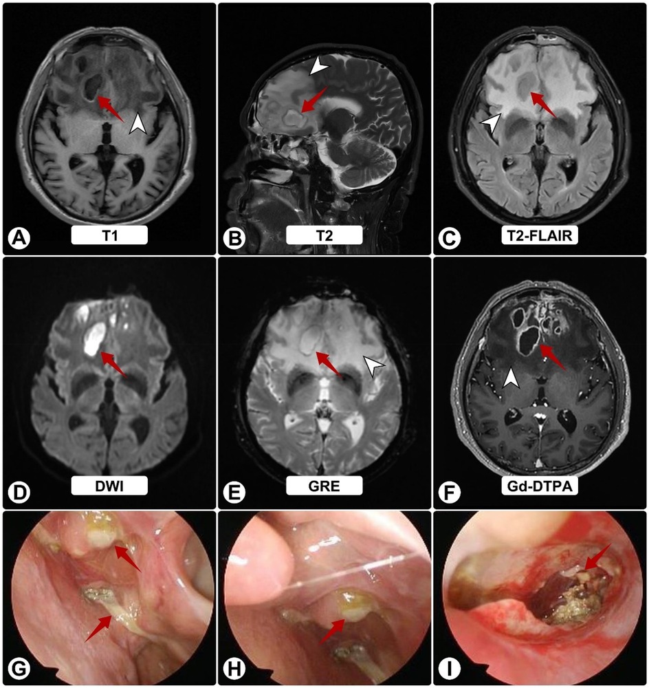 MRI and endoscopic images showing various brain scans and nasal passage details. Panels A to F depict brain scans in T1, T2, T2-FLAIR, DWI, GRE, and Gd-DTPA sequences, each marked with red arrows indicating areas of interest and white arrowheads suggesting additional focus areas. Panels G to I show endoscopic views of the nasal passages, highlighting abnormalities or lesions with red arrows.