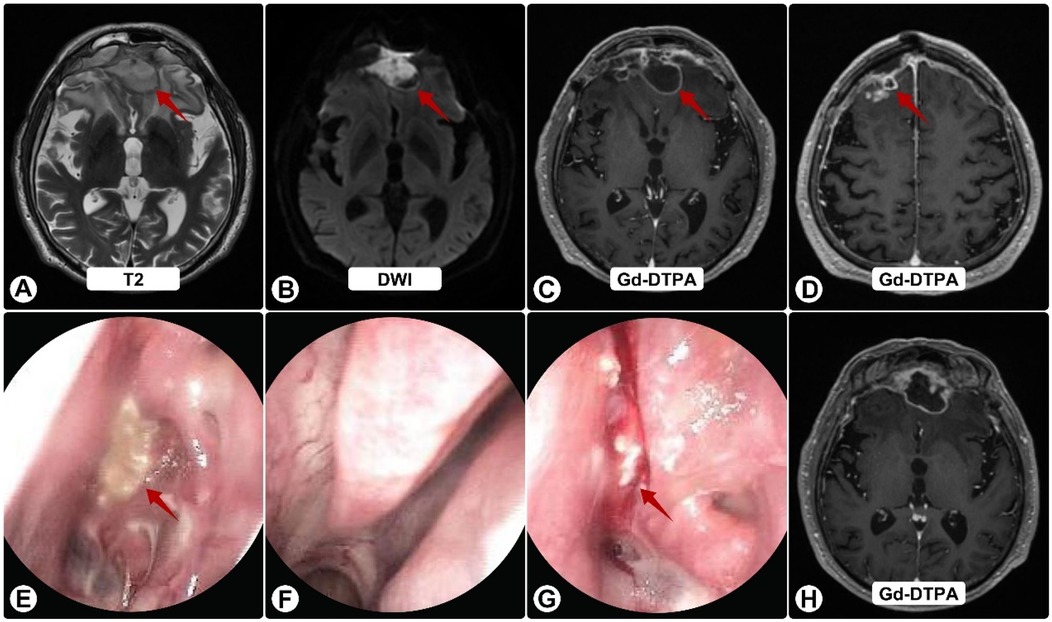 Figure 2. Follow-up brain MRI and nasal endoscopy. (A) T2-weighted image showing enlargement of frontal lesions (red arrows) with increased edema. (B) DWI shows persistent restricted diffusion. (C,D,H) Gd-DTPA–enhanced images demonstrate continued ring enhancement, with some solid components (H), (E–G) Endoscopy reveals persistent purulent secretions (red arrows) on the nasal mucosa (E), left middle meatus (F), and sphenoid sinus ostium (G), despite antibiotics.