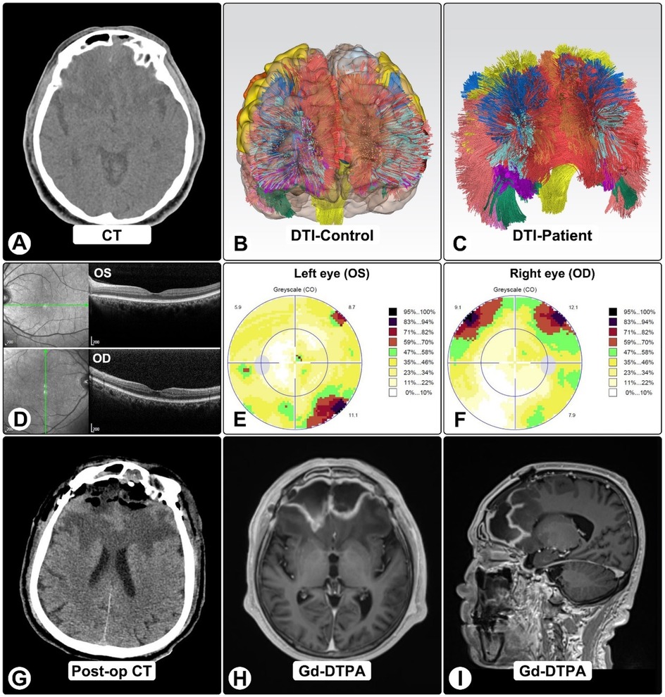 Panel of medical images: A shows a CT brain scan. B displays a diffusion tensor imaging (DTI) scan of a control subject's brain. C presents a DTI scan of a patient's brain. D depicts optical coherence tomography (OCT) images of both eyes. E and F are visual field maps for the left and right eyes, respectively. G shows a post-operative CT brain scan. H and I feature gadolinium-enhanced MRI images, with H an axial view and I a sagittal view.