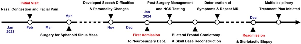 Timeline showing medical events from January 2023 to December. Key events include initial visit for nasal pain, surgery in March, speech difficulties in November, post-surgery management in January 2024, craniotomy, symptom deterioration, readmission, biopsy, and multidisciplinary treatment initiation.