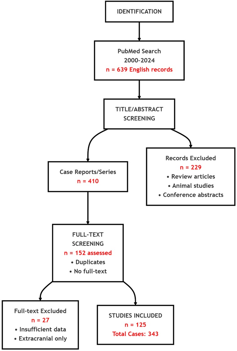 We searched PubMed for English-language reports from January 1, 2000 to May 10, 2024 using (“intracranial aspergillosis” OR “Aspergillus brain abscess” OR “central nervous system Aspergillus” OR “cerebral Aspergillus” OR “brain aspergillosis”). Inclusion required: (1) histopathological, culture, or molecular confirmation of intracranial aspergillosis; (2) radiologic evidence of an intracranial lesion (intraparenchymal or extradural); and (3) documented immune status and outcome. We excluded reviews, animal studies, conference abstracts, studies with insufficient intracranial data, and reports limited to extracranial infection. PRISMA flow: 639 records → 229 excluded at screening; after removing 258 duplicates/inaccessible texts, 152 full texts reviewed; 27 excluded; 125 studies included (343 cases) (Figure 5).