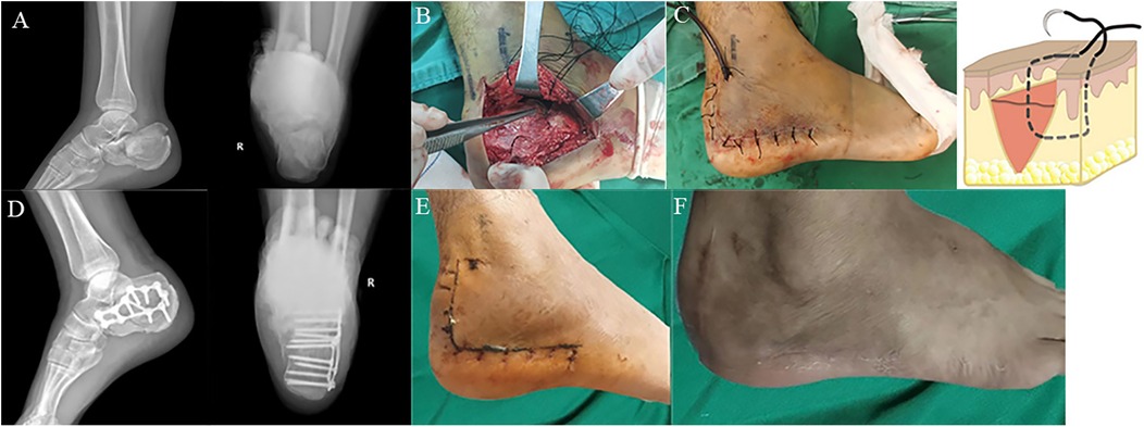 Figure 1. (A) Lateral and harris view radiographs of the right displaced intra-articular calcaneus fracture with significant articular depression and comminution; (B) the “dynamic hook technique” exposes the flap; (C) Allgöwer-Donati suture flap and suture schematic diagram; (D) lateral and harris view radiographs of the right calcaneus status post fixation using fragment plate; (E) the incision was sutured 2 weeks after operation, and class A healing was achieved; (F) follow up of incision conditions at 3 months after surgery.