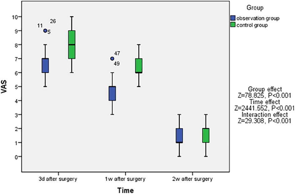 Furthermore, a reduction in the VAS scores was observed in both the observation and control groups. And patients in the observation group had significantly lower VAS pain scores at each time point after surgery when compared to the control group (P < 0.05, Figure 2).