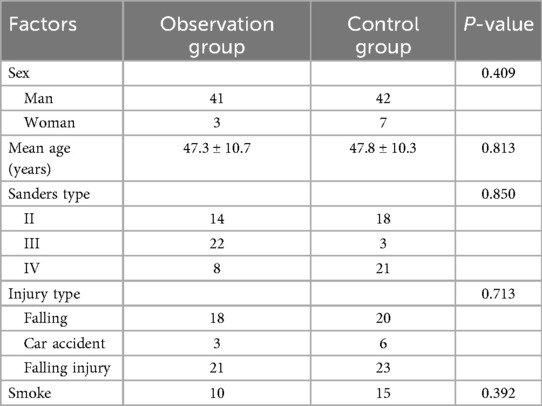 When using the ELA for calcaneal fractures, it is crucial to consider the timing of surgery, as this can significantly reduce complications associated with surgical incisions (11). Following a calcaneal fracture, the soft tissue surrounding the foot experiences considerable swelling. In the case of the ELA, it is generally necessary for the swelling to subside almost completely, which typically requires an extended period (12). All patients received soft tissue ice packs, had their affected limbs elevated, and engaged in various foot activities to mitigate swelling prior to surgery. Surgical intervention was deemed possible only after wrinkles appeared in the surrounding soft tissue skin. In this study, both the observation group and the control group underwent surgical treatment after the appearance of wrinkles in the calcaneal soft tissue, thereby eliminating this factor as a potential confounder. Risk factors for incisional complications following closed calcaneal fractures include surgery performed within 7 days of the fractures, surgical durations exceeding 1.5 h, absence of postoperative drainage, static skin dispersion, and patient smoking (13). Recent research indicates that smoking has the most significant adverse effect on the healing of skin flaps after calcaneal fracture surgery (14). Consequently, it is imperative for all patients preparing for surgery to abstain from smoking both prior to the procedure and until the wound has fully healed. In this study, 2 patients in the observation group who experienced epidermal necrosis had a long-term smoking history prior to surgery, while in the control group, five out of eight patients with postoperative incisional complications also had a long-term smoking history. However, there was no statistically significant difference in the comparison of postoperative incision complications between these two groups concerning smoking factors (P > 0.05), thereby excluding the influence of this variable on the findings of this study.