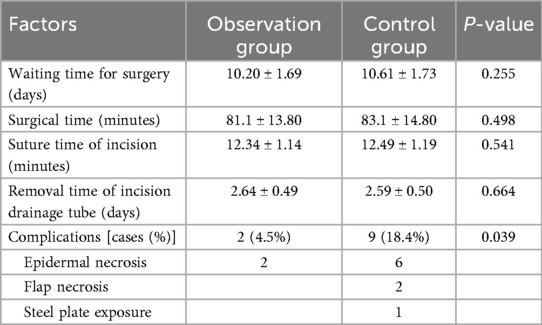 In terms of incisional complications after surgery, in the observation group, epidermal necrosis was found in 2 patients, skin flap necrosis and steel plate exposure were not noted, the overall complication incidence was 4.5%. Conversely, in the control group, 6 patients experienced epidermal necrosis, 2 patients developed skin flap necrosis, and 1 patient developed steel plate exposure, the complication incidence rate was 18.4%. There were statistically significant differences in the complication incidence rate between the two groups (P < 0.05, Table 2).