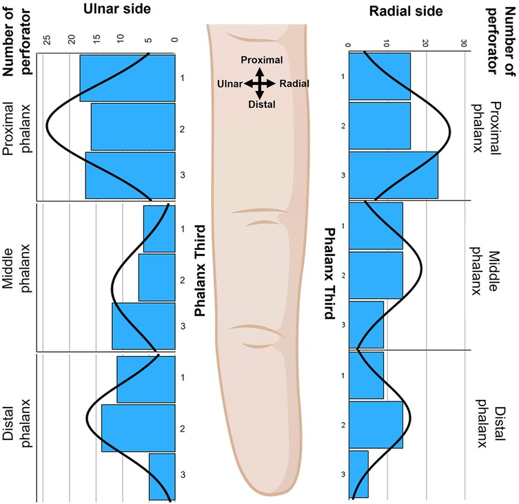 Further analysis using independent t-tests and one-way ANOVA showed no significant differences in the number of DAPs between hand laterality (P = 0.51), digits (P = 0.59), finger sides (P = 0.10), and phalanx thirds (P = 0.39). However, there were significant differences found between the number of DAPs based on the type of phalanx (P < 0.01), indicating that phalanx type influences the number of perforators.
