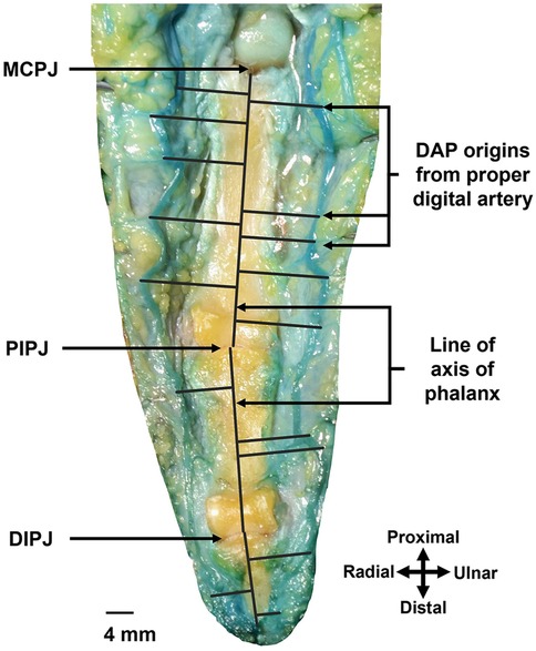 Methods: Sixteen triphalangeal digits (excluding thumbs) from four female cadaveric upper limbs (mean age: 83 years) were injected with gelatin dye and dissected to expose DAPs. Photographs of the dissections were analyzed for DAP distribution across hand laterality, digit type, finger sides, phalanges, and phalanx thirds.