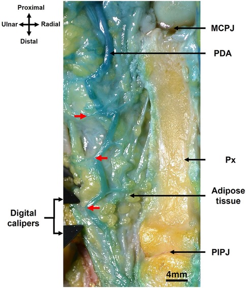 Figure 3. DAPs (red arrows) in relation to their origin, the proper digital artery (PDA) and MCP joint (MCPJ) in the proximal phalanx (Px) of right middle finger, as dissected from the palmar approach. The PIP joint (PIPJ) is also visible.