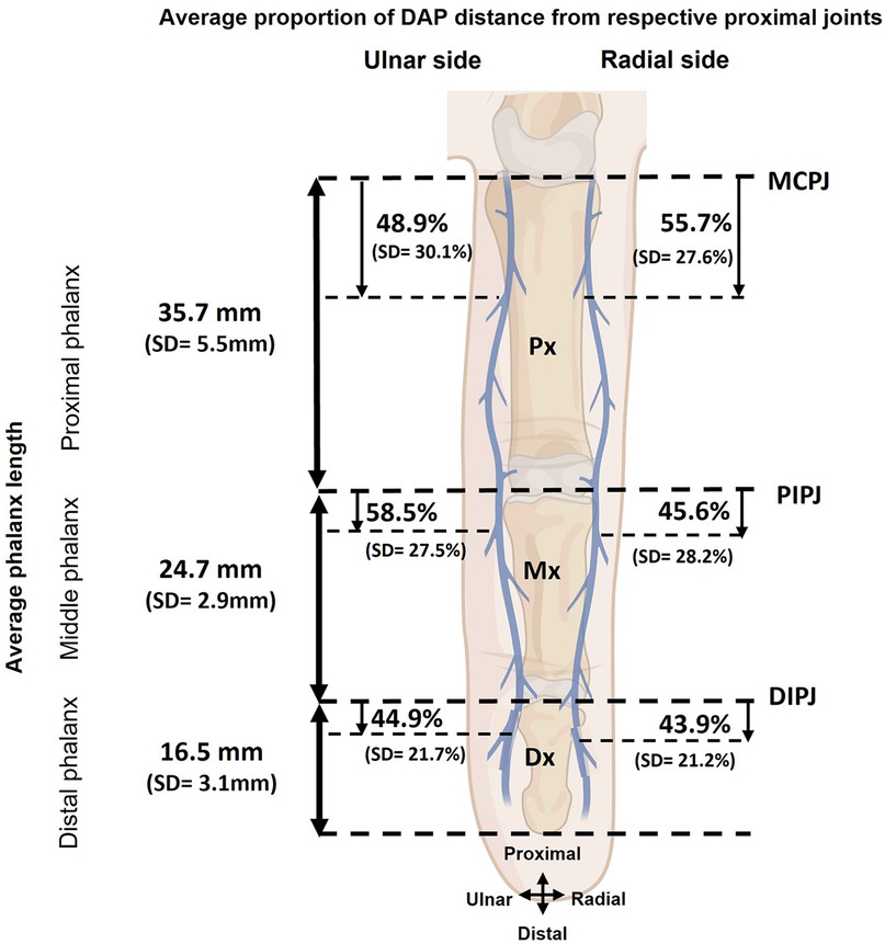 Figure 4. Average DAP distance from respective proximal joints (MCPJ: MCP joint, PIPJ: PIP joint, DIPJ: DIP joint) based on radial and ulnar sides. The image was created by author using Biorender.com. SD, standard deviation.