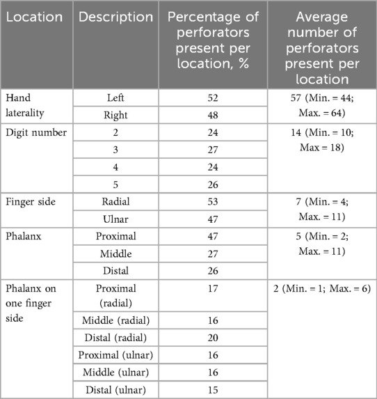 Results: A total of 226 perforators were identified. On average, there were 57 DAPs per hand, 14 per digit, seven per finger side, five per phalanx, and two per phalanx third. Each phalanx contained at least one DAP, with an average of two DAPs per phalanx per finger side.