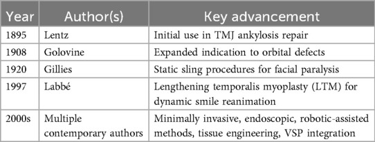 A chronological overview of major historical milestones in the evolution of the temporalis muscle flap, from its initial application in temporomandibular joint surgery to modern tissue engineering approaches, is summarized in Table 1. This progression underscores the flap's transformation from static structural use to dynamic and precision-guided applications in facial reanimation and skull base reconstruction.