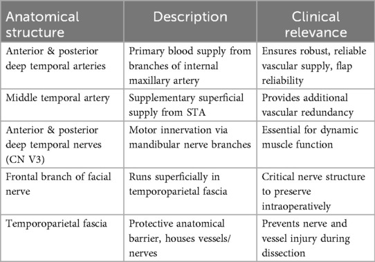 Anatomically, the TMF receives a dual arterial supply primarily from the anterior and posterior deep temporal arteries (branches of the maxillary artery) and secondarily from the middle temporal artery, a branch of the superficial temporal artery. Given its Mathes–Nahai type III vascular pattern (see §3.1), the TMF remains highly reliable in challenging reconstructive settings, including irradiated or vessel-depleted fields (4, 5).