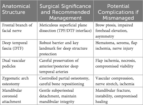 A synthesized overview of these structures including their anatomical course and surgical significance is provided in Table 2, serving as a practical intraoperative reference for preserving functional and vascular integrity during TMF procedures.