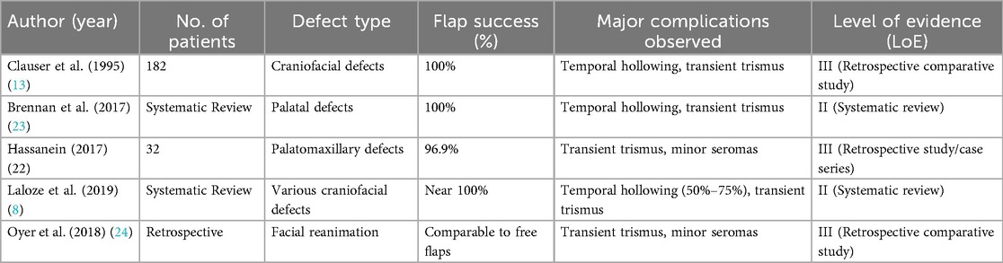 Despite these advantages, FTT entails significant complexity, long operative times, and the need for microvascular anastomosis, which carries the risk of thrombosis (3%–10%) and may require urgent reoperation (36, 37). In contrast, TMF offers reduced operative duration, technical simplicity, and minimal flap failure risk. Its dual blood supply from the anterior and posterior deep temporal arteries ensures reliable perfusion, even in irradiated or previously operated tissuesb (4, 5). TMF is effective in reconstructing moderate-sized defects, including the orbit, midface, skull base, and intraoral regions. Clauser et al. (13) reported 100% survival in a series of 182 TMF procedures, while Brennan et al. (23) confirmed high success rates in palatal reconstructions.