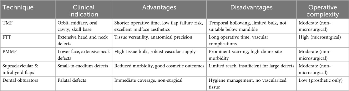 Unlike supraclavicular or infrahyoid flaps, TMF provides more reliable vascularization and ease of harvesting. However, its limitations include insufficient reach for defects below the mandible or in the cervical/esophageal region, where PMMF or LDF are preferred (35, 37). In palatal reconstruction, TMF outperforms obturators, which lack tissue integration and require maintenance. TMF provides permanent closure and improved functional and quality-of-life outcomes (35, 37).