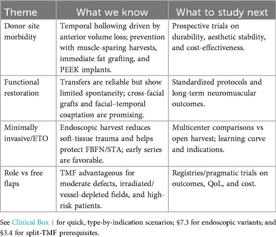 Temporal hollowing remains the key aesthetic concern, driven by anterior volume loss and inadequate fascial support. MRI-based planning enables individualized prevention. Partial muscle-sparing harvests, immediate fat grafting, and patient-specific PEEK implants show promise, but require prospective validation for durability and cost-effectiveness (13, 21, 22, 43, 44).