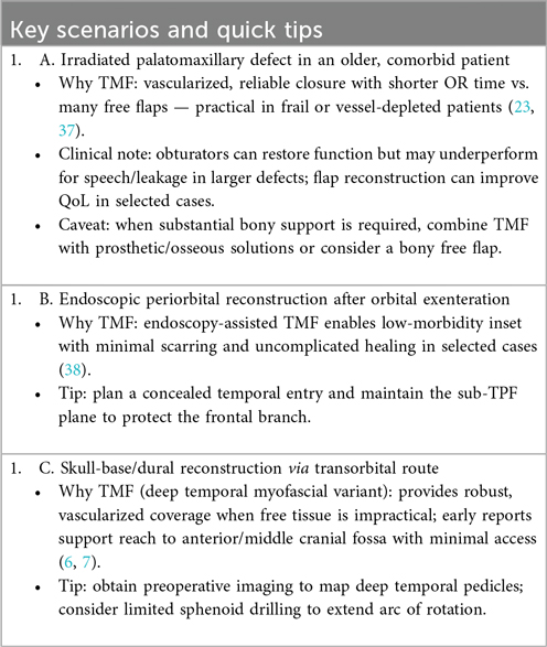 Decision framework. Selection should be indication-driven and explicitly balance resources, patient risk, and functional/aesthetic goals. High-yield scenarios favoring TMF are summarized in Clinical Box 1; a structured head-to-head overview is provided in Table 6. For endoscopic indications see §7.3, and for planned muscle splitting across separate reconstructive sites see §3.4 (10, 17, 18).