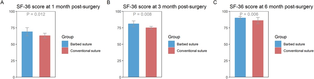 The results showed that at 1, 3, and 6 months postoperatively, the SF-36 scores in the barbed suture group were significantly higher than those in the conventional suture group (Figures 1A–C).