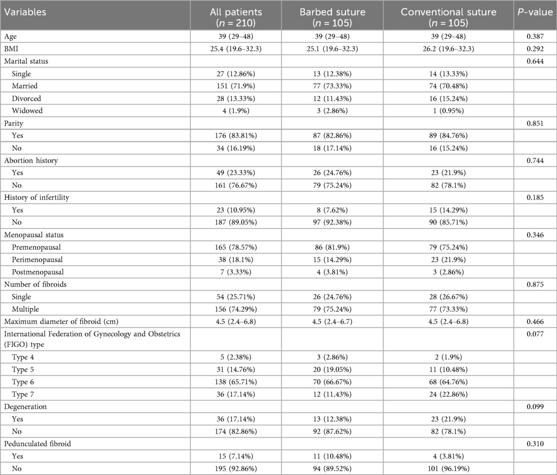 This retrospective study included patients who underwent laparoscopic myomectomy at our hospital between January 2021 and June 2024. Inclusion criteria were: (1) age ≥18 years; (2) uterine fibroids classified as international federation of gynecology and obstetrics (FIGO) Type 4, Type 5, Type 6, or Type 7, with a scheduled laparoscopic myomectomy (13); and (3) meeting surgical indications. Exclusion criteria included: (1) presence of severe systemic diseases such as malignancies or serious cardiopulmonary conditions; (2) severe hepatic or renal insufficiency; (3) significant psychiatric illness or poor compliance; and (4) missing key data (e.g., suture method). Patients were divided into two groups based on the suturing technique: the conventional suture group and the barbed suture group.