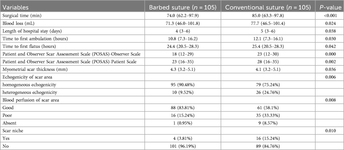 The results indicated that the barbed suture group had significantly shorter operative time (P < 0.001), less intraoperative blood loss (P = 0.024), shorter hospital stay (P = 0.038), earlier time to first ambulation (P = 0.030), and earlier time to first flatus (P = 0.042). Regarding uterine integrity, patients in the barbed suture group had significantly lower POSAS scores (observer scale: P < 0.001; patient scale: P = 0.002), greater myometrial scar thickness (P = 0.036), more homogeneous echogenicity in the scar area (P = 0.006), better blood perfusion in the scar region (P = 0.008), and a lower incidence of scar niche (P = 0.010) (Table 2).