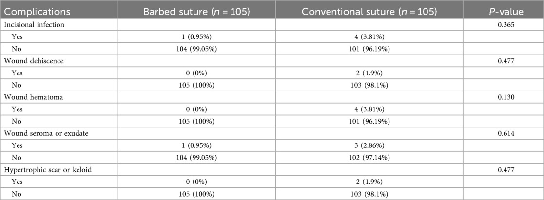 Due to the shorter operative time in the barbed suture group, the wound is exposed to air (and potential bacterial contamination) for a shorter duration, thus reducing infection rates. The uniform tension distribution aids in tight wound edge approximation, promoting healing and lowering the risk of dehiscence, hematoma, or hypertrophic scar formation due to asymmetrical closure or overly tight sutures. Better tissue approximation also reduces wound gaps, preventing fluid infiltration into surrounding areas and decreasing seroma or exudate formation. Enhanced perfusion with barbed sutures can improve local circulation, promote early healing, and reduce fluid accumulation. It should be noted that although the incidence of wound complications in the barbed suture group was lower than that in the conventional suture group, none of the differences reached statistical significance due to the limited sample size. Therefore, these results can only be cautiously interpreted as suggesting that barbed sutures may help reduce the risk of wound complications to some extent, but no definitive conclusions can be drawn. This also indicates that future studies with larger sample sizes are needed to further validate the potential advantages of barbed sutures in postoperative wound management.
