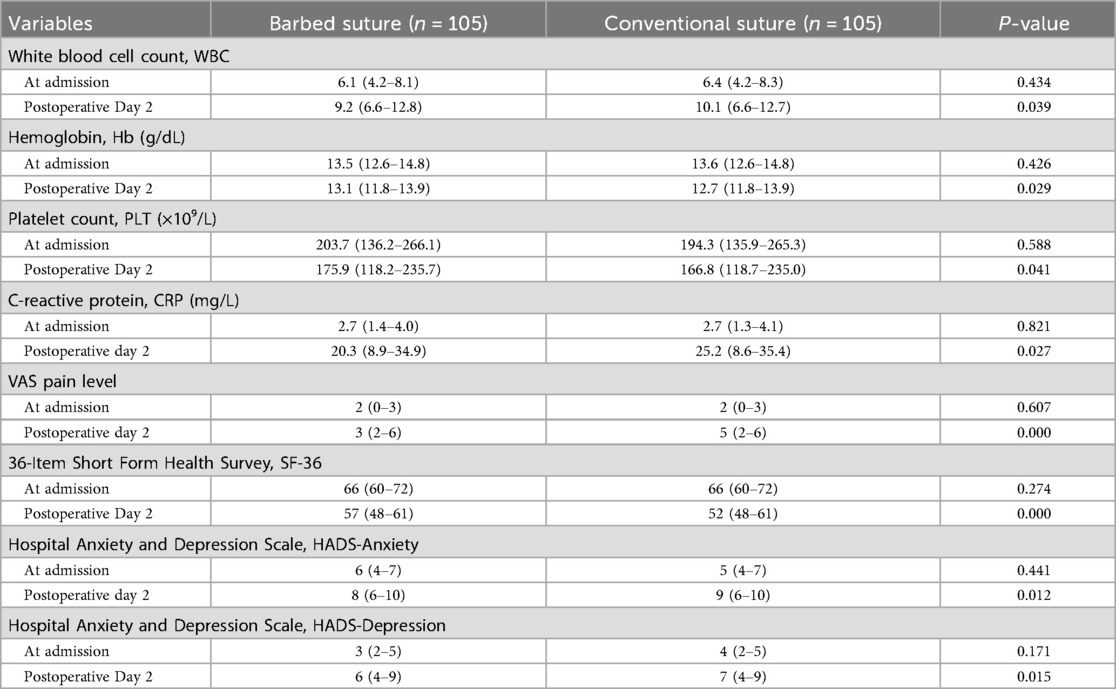 At admission, there were no significant differences between the two groups in white blood cell count, hemoglobin level, or platelet count. On postoperative day 2, the barbed suture group had significantly lower WBC levels (P = 0.039), higher Hb levels (P = 0.029), higher PLT levels (P = 0.041), lower CRP levels (P = 0.027), lower VAS pain scores (P < 0.001), higher SF-36 scores (P < 0.001), lower HADS-Anxiety scores (P = 0.012), and lower HADS-Depression scores (P = 0.015) (Table 4).