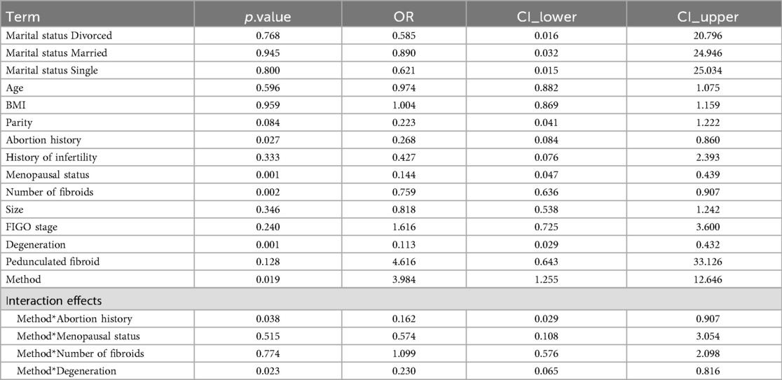 The results showed a significant interaction between suture method and history of abortion (OR = 0.162, P = 0.038), with a negative interaction coefficient, indicating that barbed sutures had a more pronounced positive effect on uterine integrity in patients without a history of abortion, while the impact was relatively smaller in those with an abortion history. The interaction between suture method and fibroid degeneration also showed a negative effect on uterine integrity (OR = 0.230, P = 0.023), suggesting that barbed sutures are more suitable for patients without fibroid degeneration (Table 5).